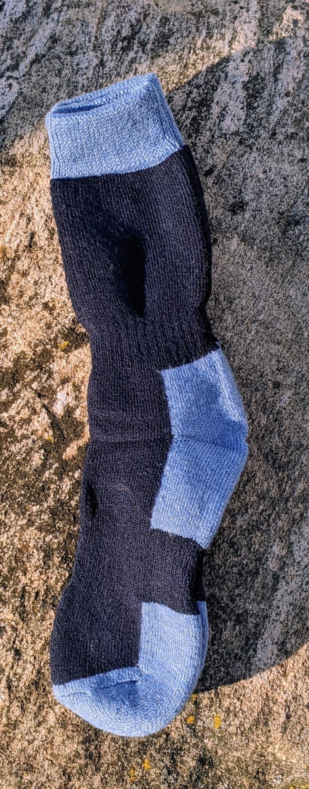 Personally, this is one of my “most” favorites of the hiking hose. It is like having pillows on your feet…pillows being warm, soft and thicker. These hose are great for hiking since they add more protection padding to your feet and stretch up high to protect against ticks and low lying brambles. Composed of 85% Merino wool and Acrylic, 10% Nylon and 5% Lycra. They are made in Scotland. Machine washable, however, I hang dry mine to keep them in proper shape. A great gift option.