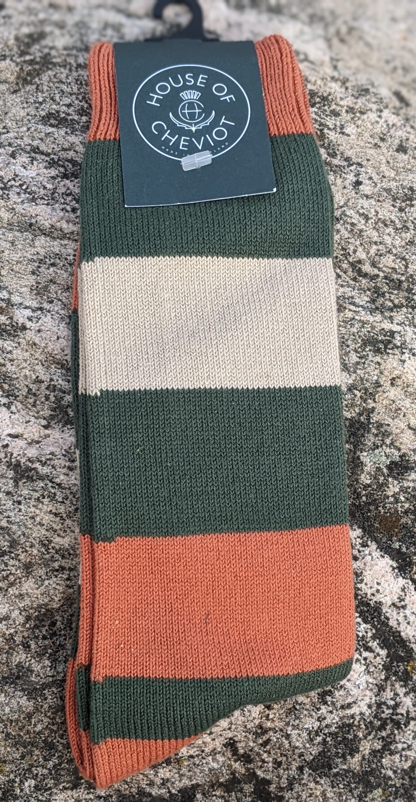 Stripes in Cotton Casual style Socks understated in color, yet soothing and distinctive. A unique blend of olive green and muted orange. A good look with casual leather shoes. Crafted by the most luxurious sock maker in Scotland, House of Cheviot. Green and Orange Stripe socks are composed of 85% cotton and acrylic , 10% Nylon and 5%