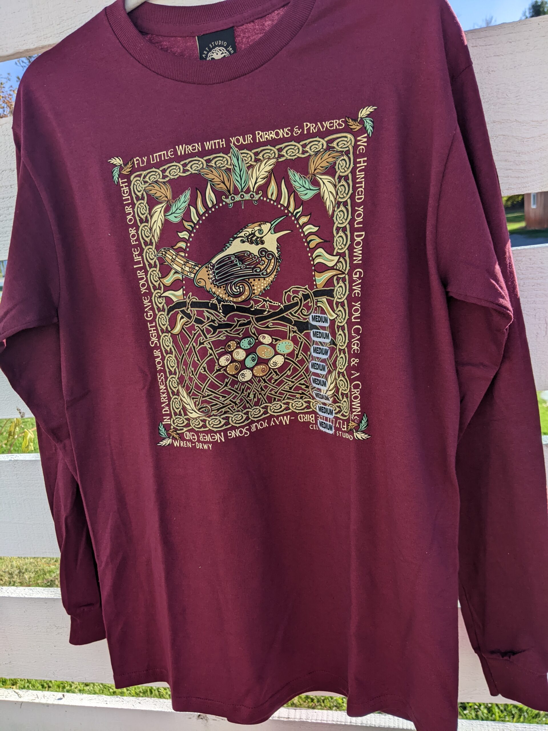 Sweet as the song of the Wren…this T-shirt exemplifies the importance of the Wren in Celtic and Medieval Culture. The Wren was brought into the royal courts to entertain all with their pleasant song. The T’s are made with a heavier USA cotton that is perfect for the long sleeve purpose! Turn inside out, Machine wash in warm water, and hang dry to keep that “new” look.