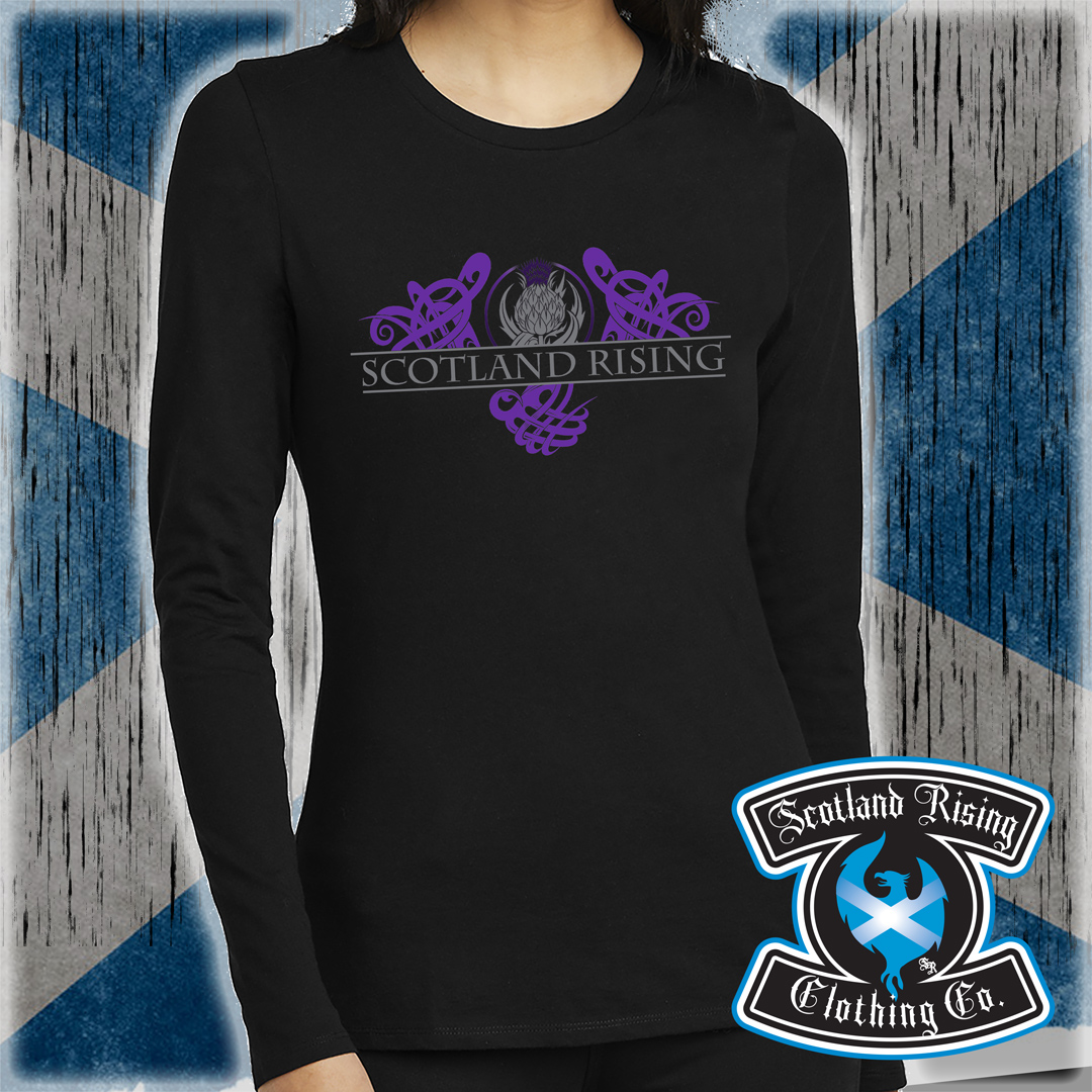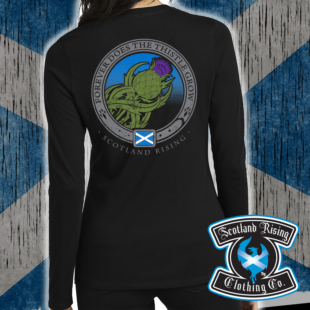 Who can resist long sleeve T-shirts to ward off the cold? This attractive shirt specifically denotes the Thistle, the flower of Scotland. Tasteful design on the front of the shirt, with a fabulous thistle on the back. Highly unique, super cool looking and a sure pleaser! Best to hang dry after washing.