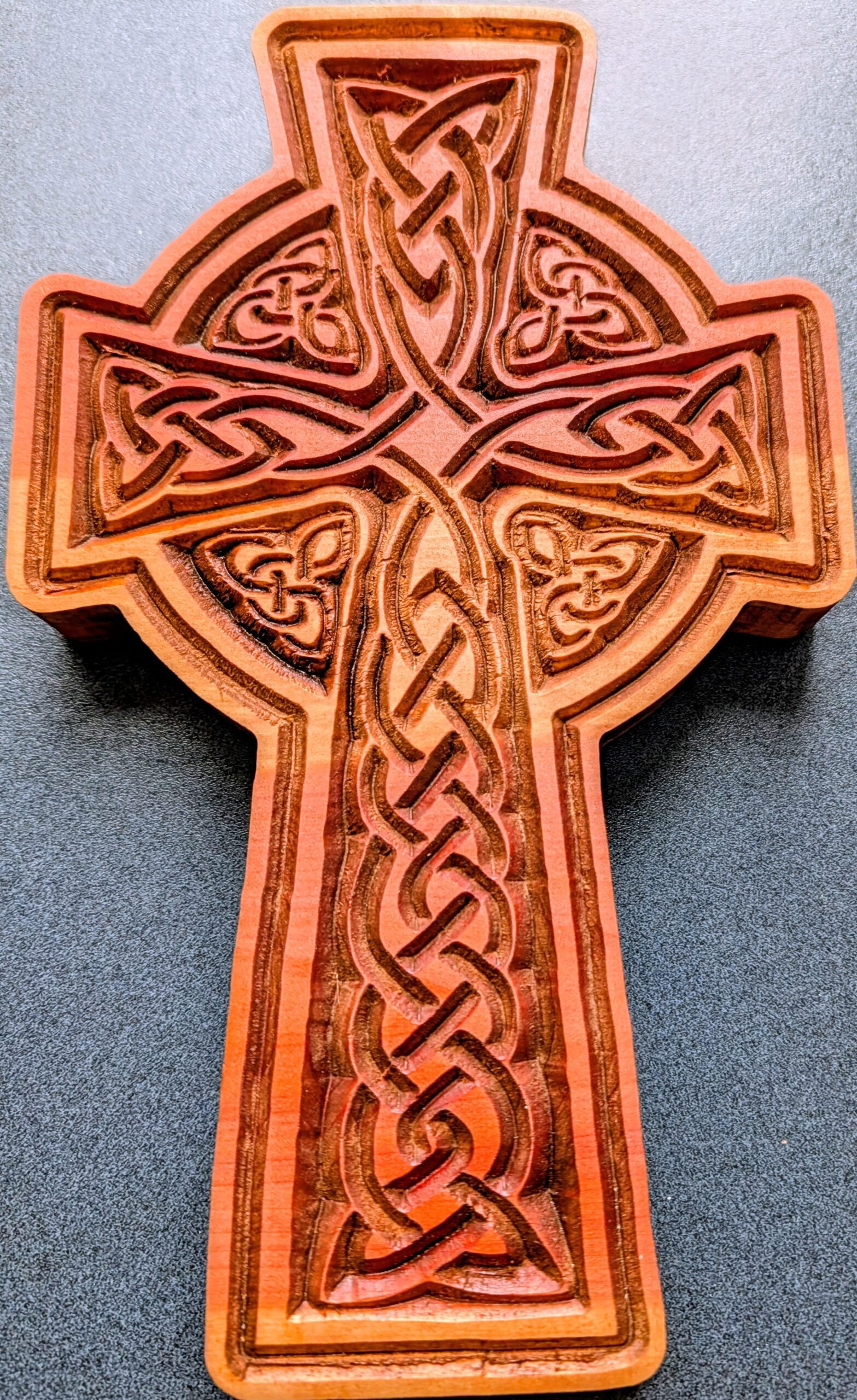 The quintessential Celtic Cross with all its beautiful detail. Originating in Early Medieval Ireland and Britain symbolizing the blending of the the Christian and Celtic traditions. The central circle represented the life giving sun (pre-Christian) and symbolizing eternity and the blend of the Christian Cross symbolizing eternity and divine unity. The Celtic Cross is crafted from white pine, although available in other wood choices. Requests can be made from our Contact button on the homepage. Approximately 15″ tall, made in the USA. .
