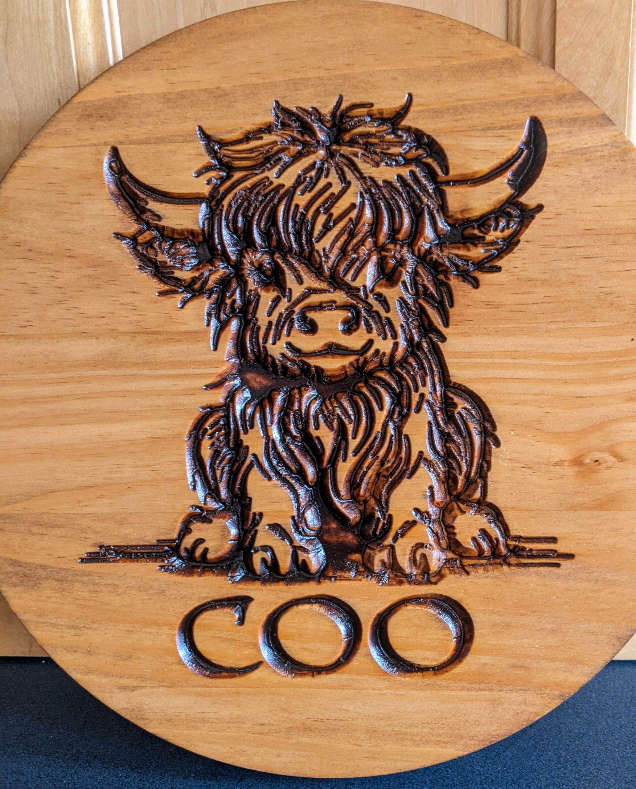 The most cutest animal to have to keep you company! Our newest addition to our Wooden Plaque line. We know there are so many Highland Cow (Coo) aficionados…and now we can add to the options! Crafted in white pine and a nice approximate size of 12″ round. Perfect for interior or exterior hanging. Angus could be his name!!!