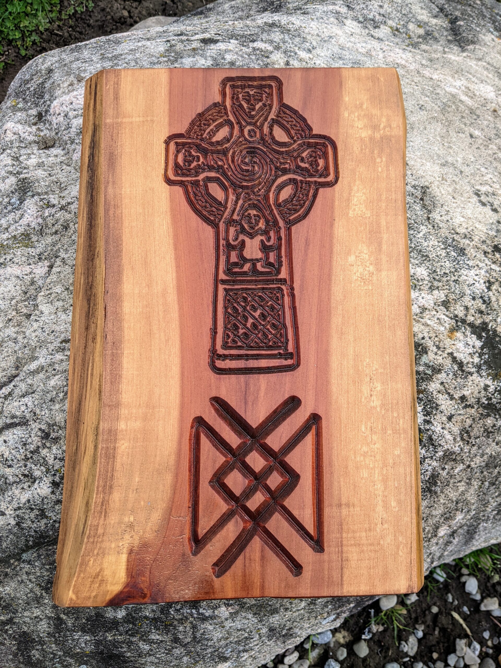 Who wouldn’t want to protect your space…whether it is you home, cottage, motorhome, etc., with double protection? The early Celtic Cross and the Vikings’ Runes combine to make an original unique design for all the Vikings and Celts out there. Approximately 14″ long and 10″ wide, and perfect for a space near a door. What a wonderful gift idea!